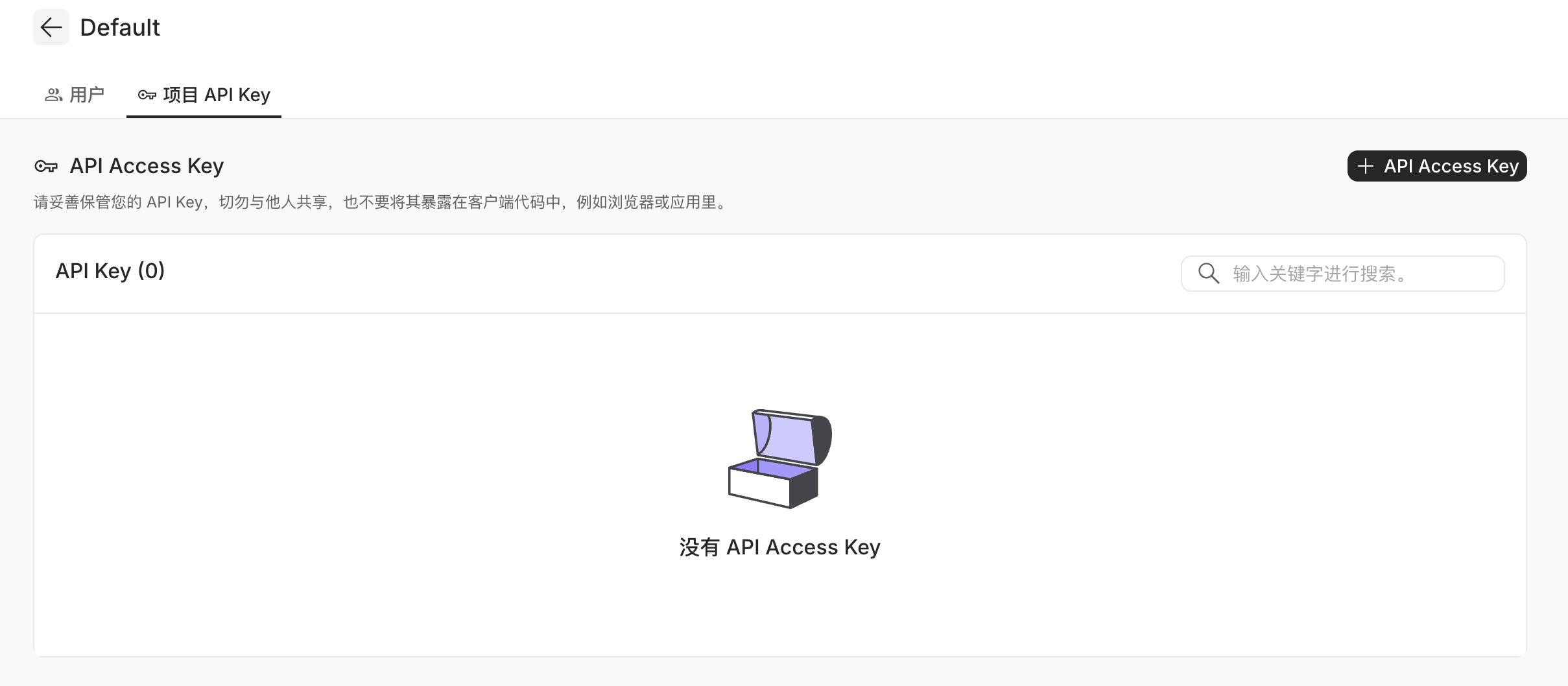 点击 项目 API Key 页签,点击 API Access Key 列表右上角的 + API Access Key 按钮。