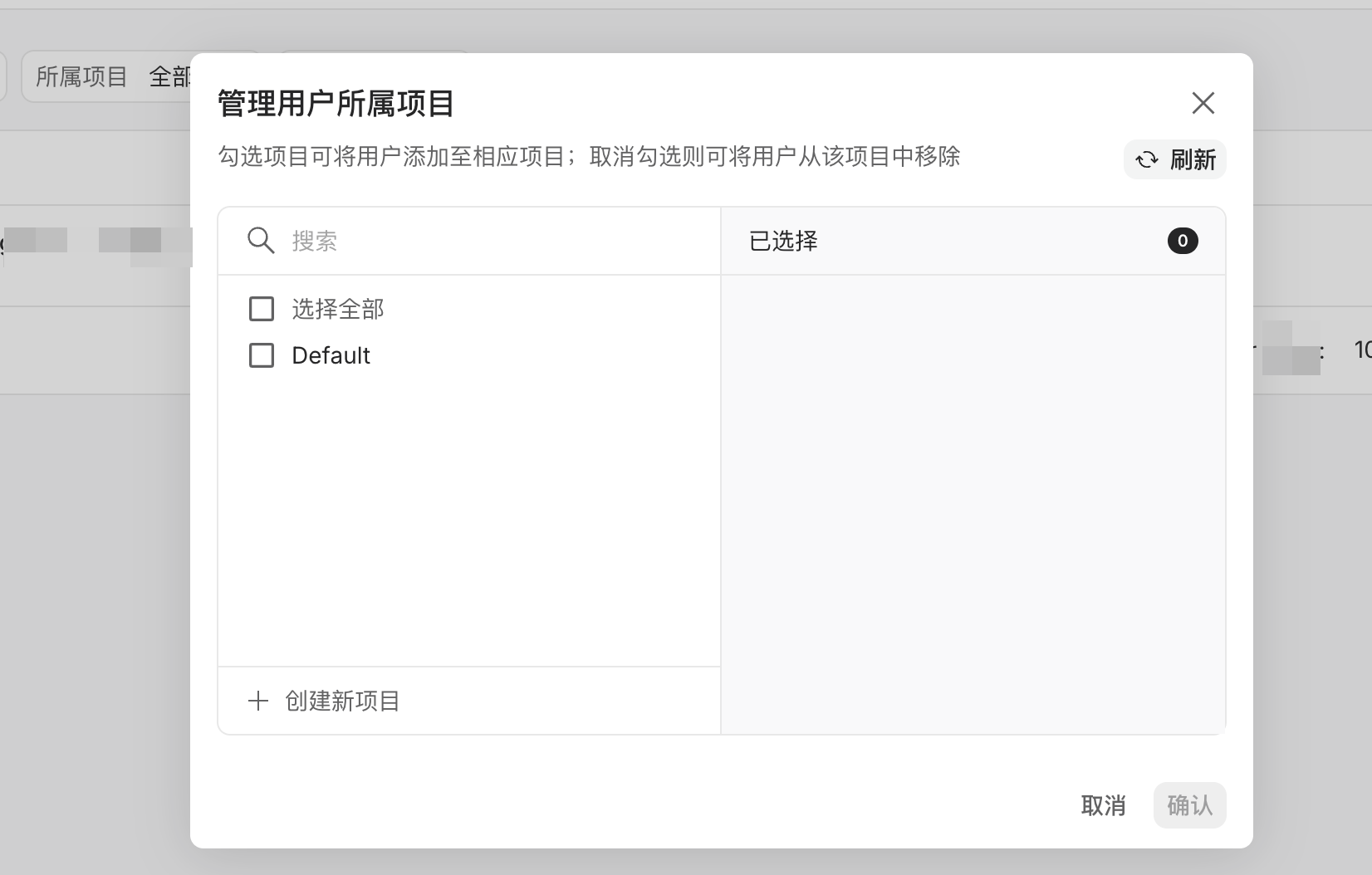 同一用户可以加入到多个项目中。如无合适的项目,您也可以点击左下角的 创建新项目 进行项目创建,然后勾选新创建的项目,完成用户添加。
