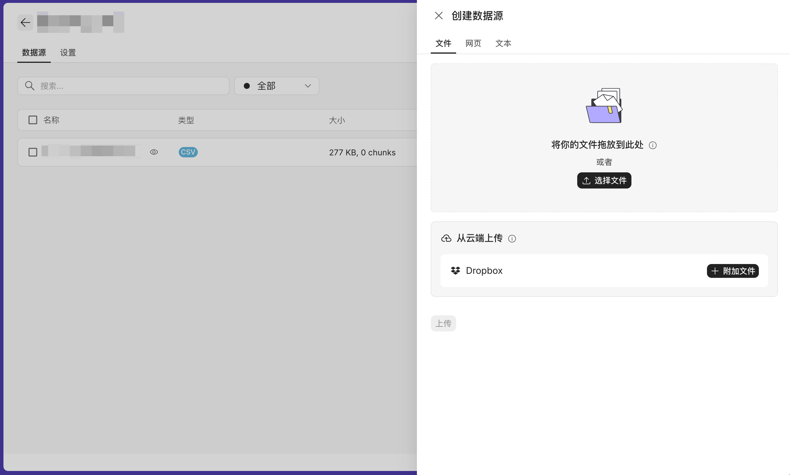 | 类型 | 数据源类型。 支持的类型包括:Excel、CSV、TSV、Markdown、PDF、JSON、Word、URL、Text 等。 |