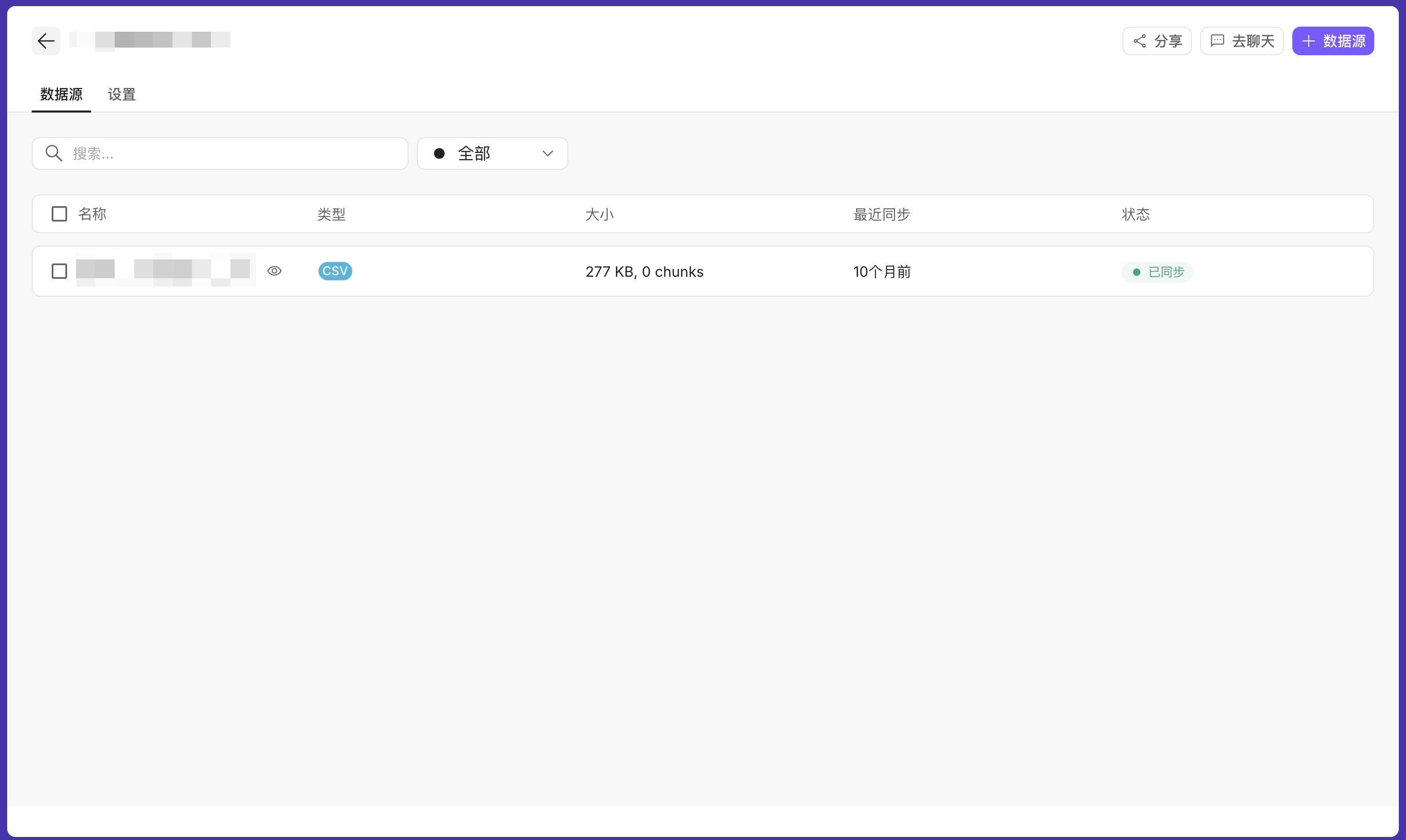 | 状态 | 数据源的状态,可能值为: - 已同步:数据源已完成同步,为可用状态。 - 同步中:数据源正在同步或者等待同步中,暂不可用。 - 同步失败:数据源同步失败,不可用。如需继续使用该数据源,需要重新上传。 |