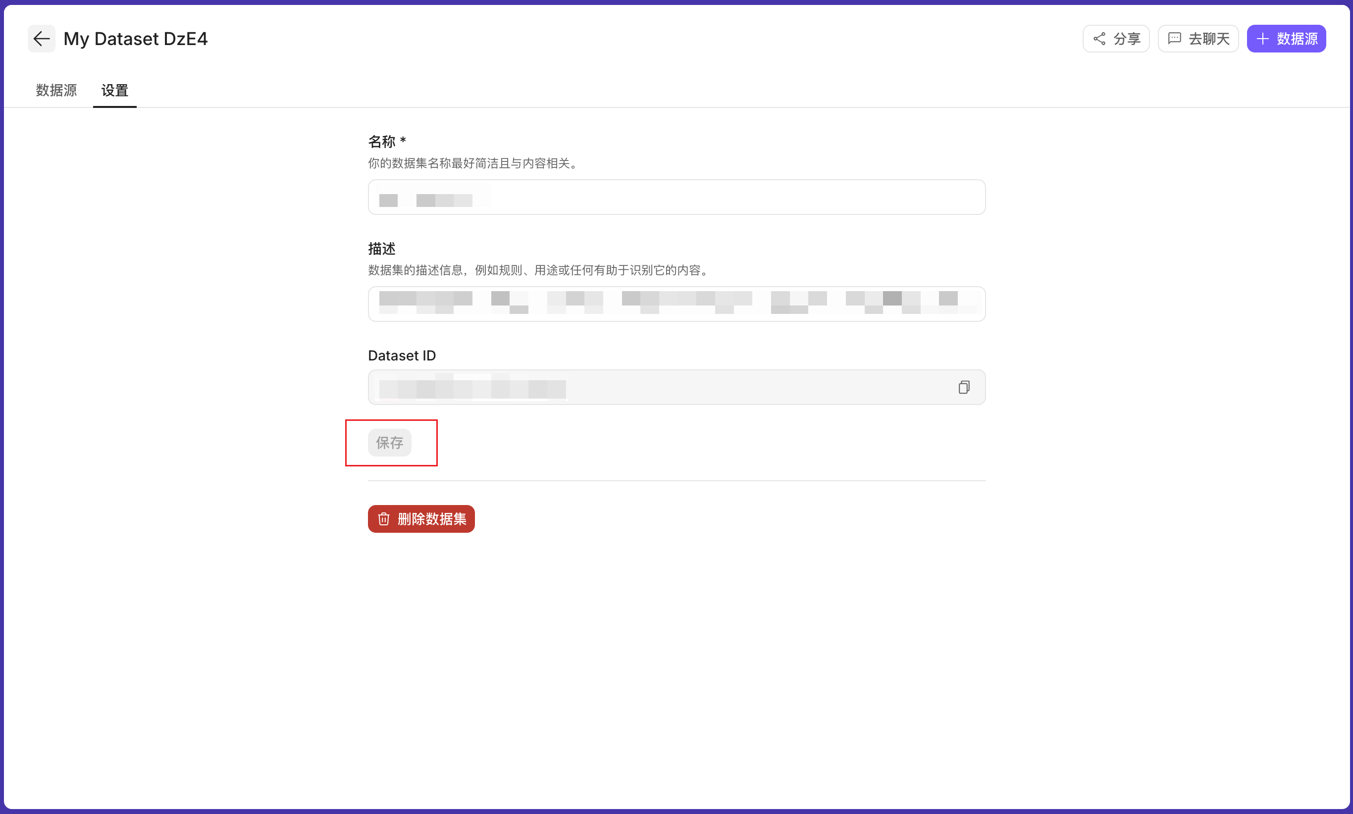 点击 设置 页签,并输入新的数据集名称或描述,点击 保存。