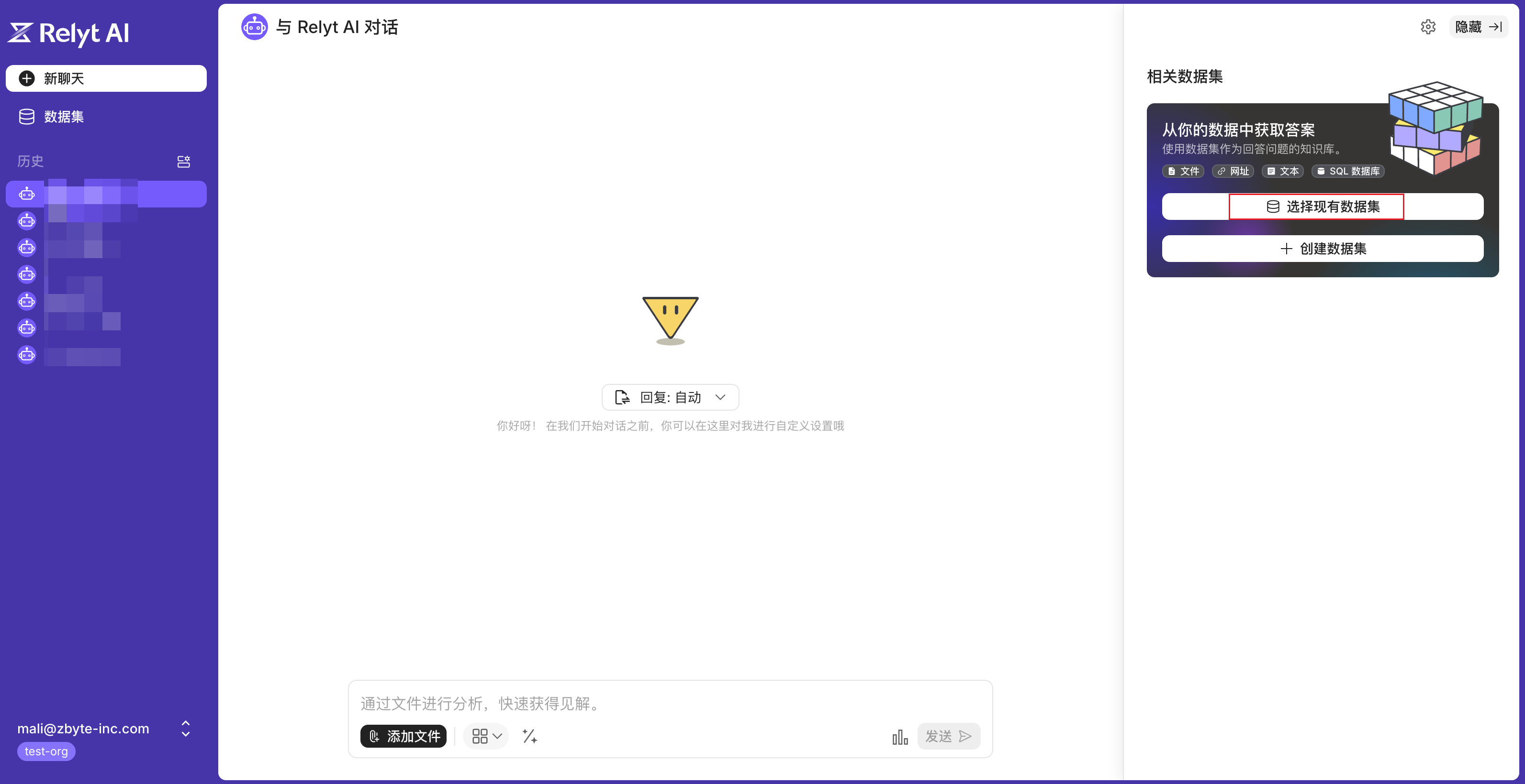 - 选择目标数据集,完成关联后,在下方对话框中,开始和您的数据集聊天。